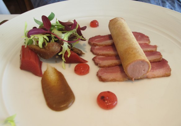 cured goose breast with chicken liver parfait, poached rhubarb, black pepper and ginger bread
