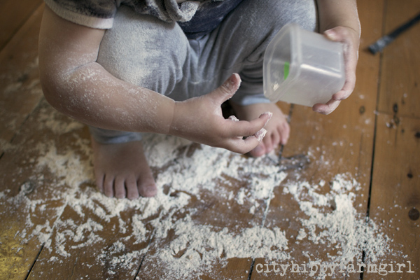 Now I look at the last photo and I am curious about if you gave him flour to stomp in or if the flour spilled and then you just let go. Freedom is about trust, wisdom and fear. Trust that kids will do the right thing and that fate will be kind. Wisdom about how good it is for kids to learn. Fear of all that might go wrong. Honestly though I have such a cautious kid that I find myself encouraging her to do things like climb trees because I loved such stuff when I was a kid. (But no fingers in the electric beaters)