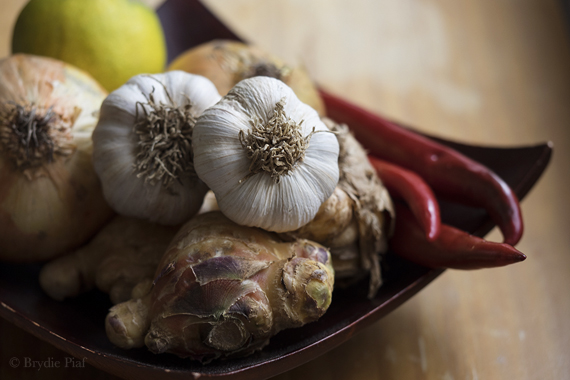 Equal parts- ginger, garlic, turmeric, onion (with optional extras chilli) Quantities will vary depending on the amount you want to make.