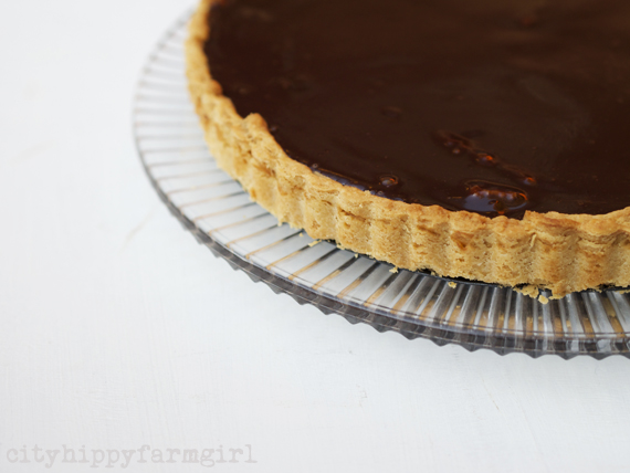 Bring the cream to a boil and then turn off heat. Drop broken chocolate into the cream and stir until melted through. Allow ganache to cool slightly and then pour over caramel tart. Allow to sit for a few hours before serving.