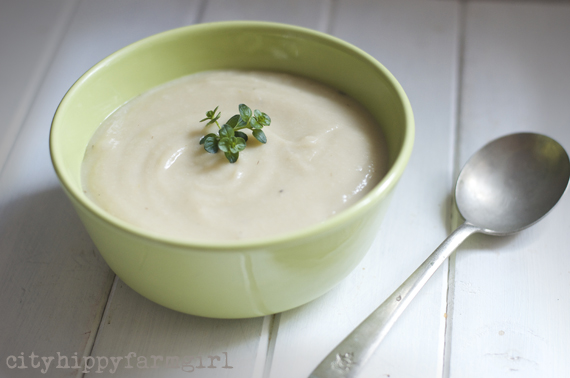Like I said, no fancy pants here. Leeks, potato, a half head of cauliflower for added good measure and water. Cook that all up until soft, blitz it with a hand held blender and delicately drop a little thyme from the kitchen window sill on the top. Add some of my favourite salt and dinner… is done.