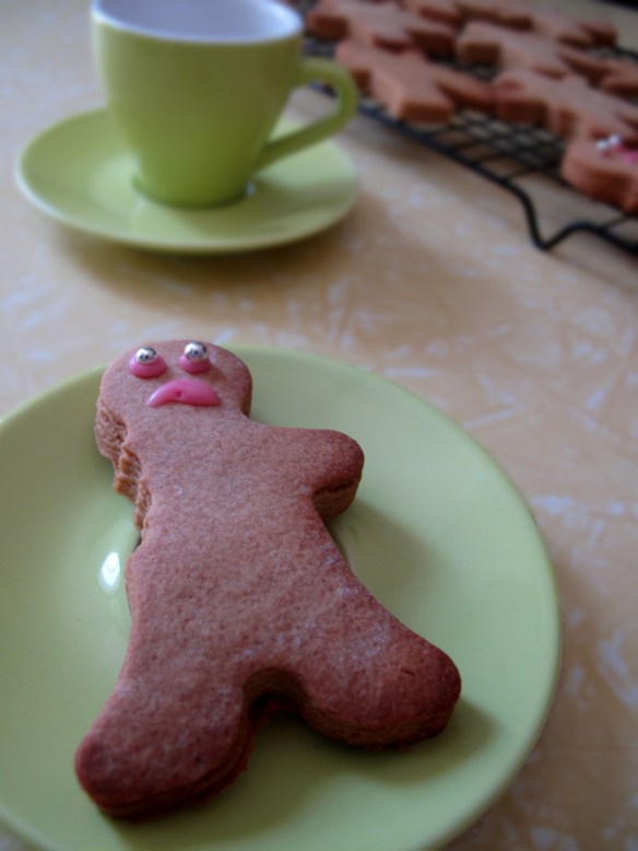 Gingerbread men. I have had the taste for these little fellas all week, and it was about time my fingers walked the talk. Besides there is nothing the monkeys like more, than helping to make biscuits.