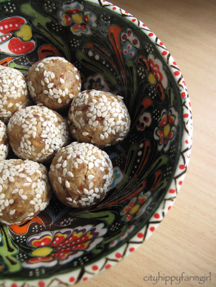 In my kitchen sits a beautiful gifted hand made bowl, with tahini balls in it. Without these little balls of energy, well…I’d be a lot less energetic. This is the recipe I gave originally, but they really are so super-duper easy to cater to your own taste buds and using whatever’s on hand in your own kitchen. (These had added dried dates and LSA in them.)