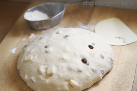 Apple and sultana dough ready to be divided into rolls. Easy thing to go into lunch boxes for small ravernous people.