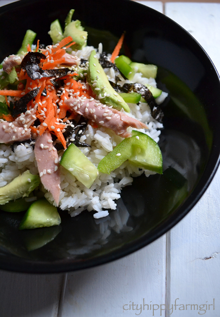 I can’t help but feel a teeny bit pleased. Pleased and proud of my vegetable loving children. Sure they won’t touch zucchini, mushrooms, sweet potato or spinach. Eggplant also isn’t getting a look in any time soon, but what they won’t eat- they make up for. If that means a bowl full of sushi, with a selection of raw vegetables in there, I’m more than happy to give it to them.