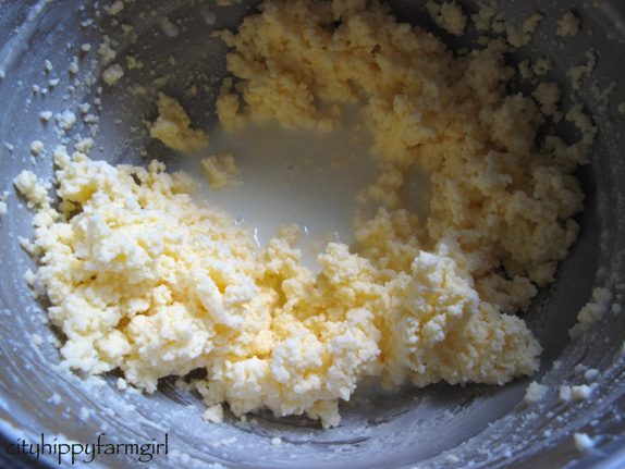 Keep it whipping until it starts to look like this. The liquid will start to separate, which is then able to be drained off. Add a pinch of salt (to taste) and keep squeezing out that excess moisture using a spatula against the side of the bowl. You don’t want any of that moisture in there. Once it is all drained off it can be shaped into what ever shape you need.
