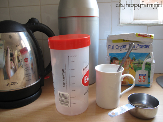 kettle, yogurt thermos, yogurt container, powdered milk, 2 heaped tablespoons old yogurt, water, measuring cup.