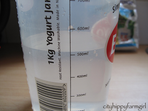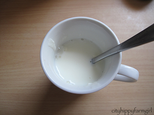Fill your kettle up and turn it on. Take 2 heaped spoonfuls of bought yogurt (like the end of the tub), add a little water to mix it, it’s now runny and set aside.