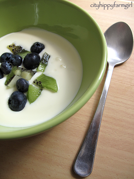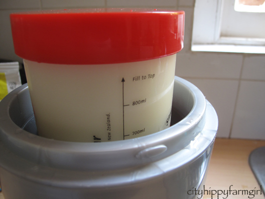Kettles boiled. Fill it up to the top of the plastic thingy inside. Place your yogurt container in with the lid on, add the thermos lid and leave it (don’t peak) for 8-12 hours. The longer you leave it the tartier it will taste. (I’ve forgotten it for 24 hours and it’s still fine.)